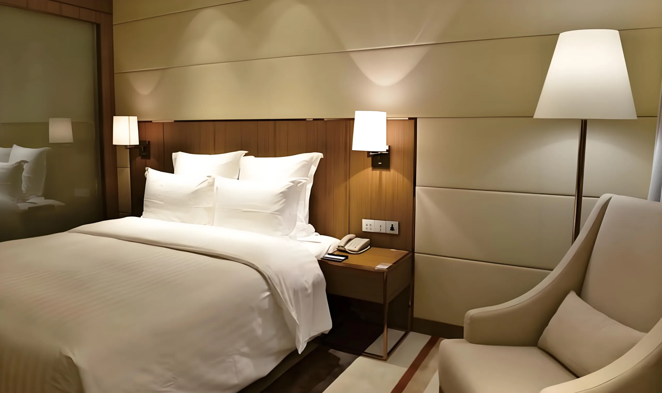 Hotel floor lamps and ceiling lamps set the overall ambiance of the guest room. Floor lamps placed in corners or beside seating areas provide warm, diffused light to soften the space, while ceiling lamps deliver general illumination for the entire room. Energy-efficient and stylish, these lamps balance functionality with design, enhancing the room’s atmosphere without consuming excess energy.
